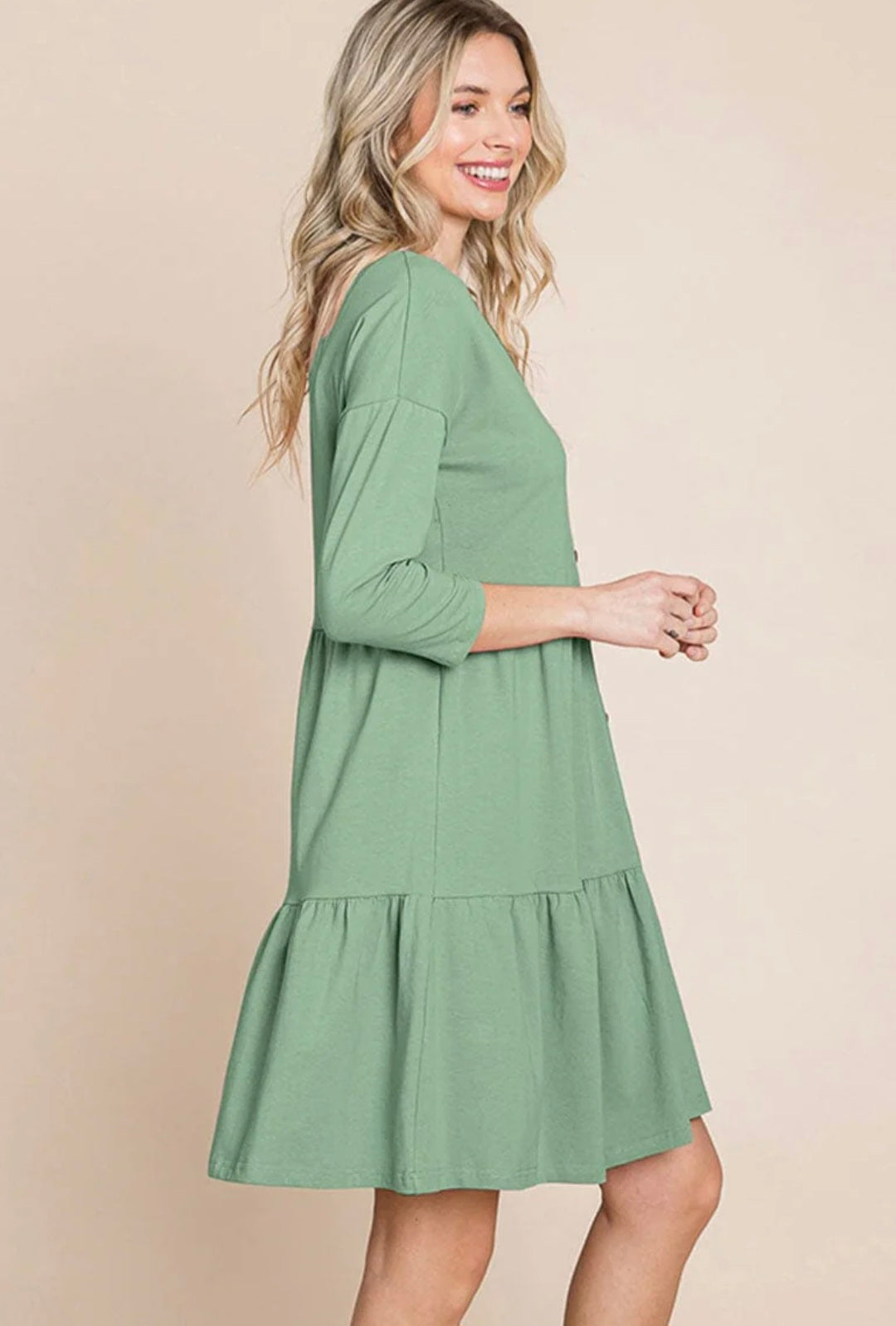 WOMEN'S 3/4 SLEEVE V-NECK BUTTON UP TIERED LOOSE FIT MIDI DRESS