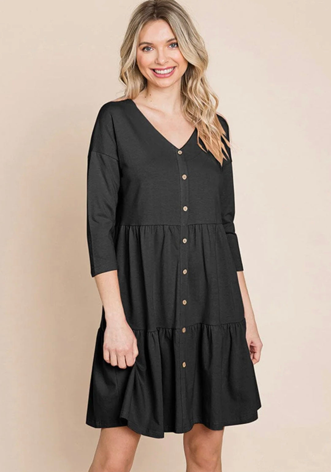 WOMEN'S 3/4 SLEEVE V-NECK BUTTON UP TIERED LOOSE FIT MIDI DRESS